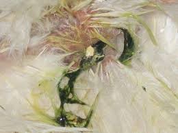 - ظهور الأعراض العصبية، على هيئة شلل في الأرجل أحدهما أو كلاهما، التواء في الرقبة ودوران الطائر حول نفسه.